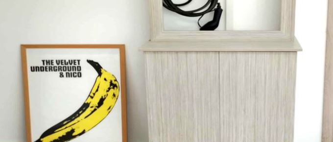 Κατασκευασμένη από πλακάζ με επένδυση δρυς, θέση για tv, ντουλαπάκια και συρτάρια με τηλεσκοπικούς μηχανισμούς, σοβατεπί από ξύλο πόπλαν περασμένο με γαλάκτωμα.