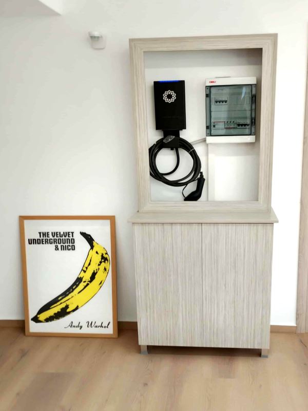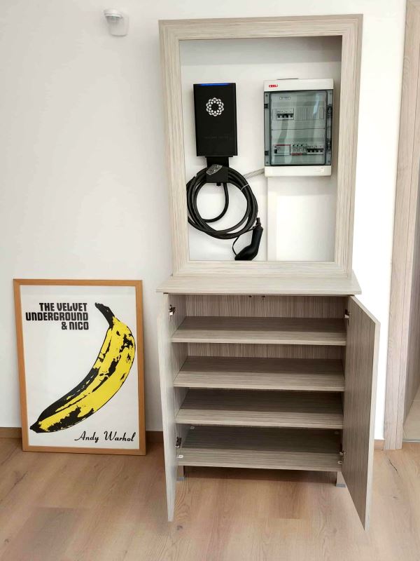 Ντουλάπι κάλυψης ηλεκτρικού πίνακα από ξύλο osb, πάχους 18 mm με αποθηκευτικά ράφια και δύο πορτάκια, μεντεσέδες blum, περασμένη με βερνίκι άχρωμο.