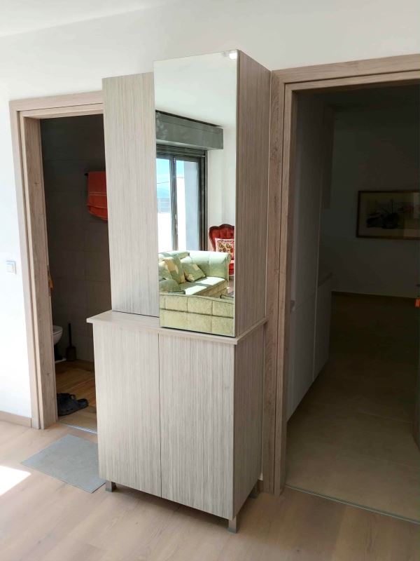 Μοντέρνα επιπλοσύνθεση και διαχωριστικό χώρου από μασίφ ξύλο έλατο. Ξύλινα ράφια και πορτάκια λακαριστά ματ χωρίς πόμολα με push - open.