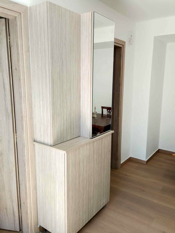 Δρύινη μοντέρνα ντουλάπα με μασίφ πηχάκια του ίδιου υλικού, πορτάκια από κόντρα πλακέ θαλάσσης επενδεδυμένα με καπλαμά δρυς, με χωνευτά πηχάκια από μασίφ δρυς, με κάθετες και οριζόντιες σκοτίες. Όλη η κατασκευή είναι περασμένη με οικολογικό βερνίκι.