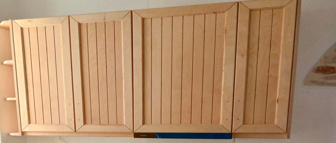 Ντουλάπια κουζίνας για βάψιμο της επιλογής σας με τελάρο και ταμπλά από κόντρα πλακέ θαλάσσης σημύδα, με κάθετες λουκιές με σχέδιο παντογράφου. Κουτιά από λευκή μελαμίνη, γωνιακοί μεντεσέδες 180° και πάτος προστασίας (υγροσυλέκτης) για το ντουλάπι του νεροχύτη.