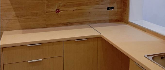 Δίχρωμη κουζίνα από μελαμίνη σε 2 αποχρώσεις, πορτάκια Ακρίτας δρυς τα κάτω και μονόχρωμα μπεζ τα κρεμαστά με διακοσμητικά ραφάκια. Κουτιά από λευκή μελαμίνη , συρτάρια με μηχανισμούς eurofit, πυρίμαχο πάγκο και πάτος προστασίας ντουλαπιών (υγροσυλλέκτης).