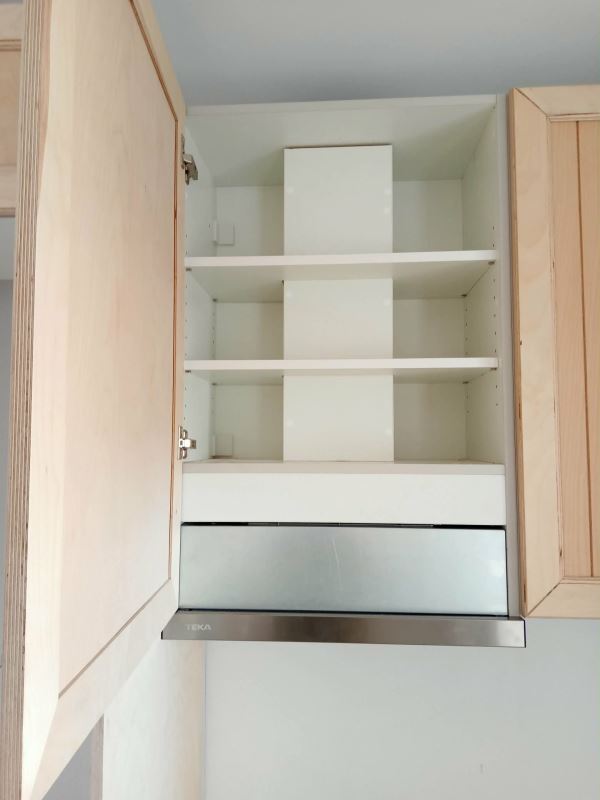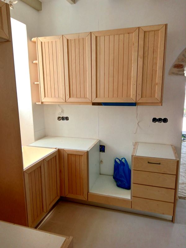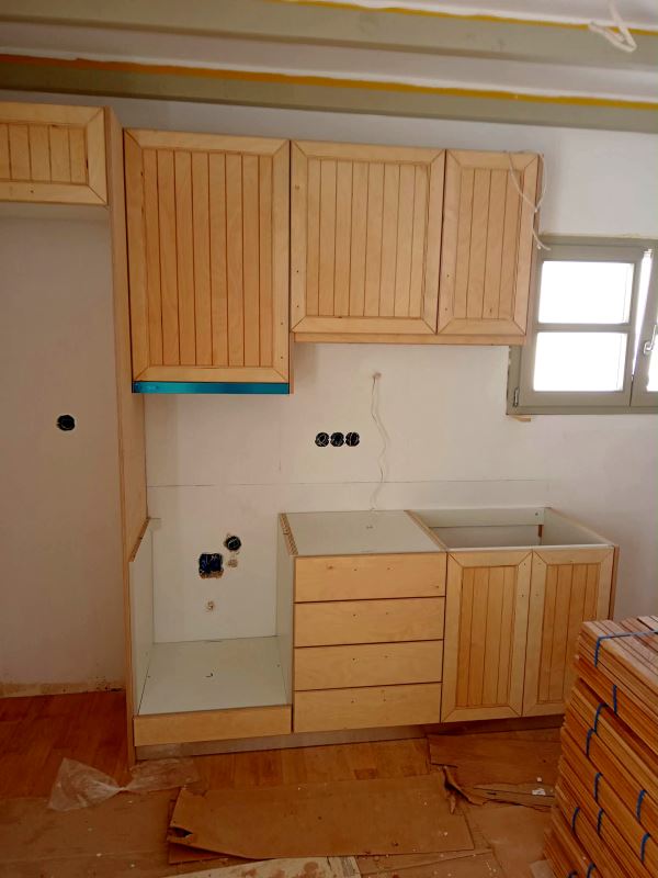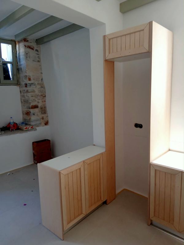 Διαχωριστικό κουζίνας από σουιδικό ξύλο με σχέδιο ραμποτέ. Μασίφ κολώνες από σουιδικό ξύλο. Ανοιχτό κουτί πίσω από το διαχωριστικό με ανοιχτά ράφια από κόντρα πλακέ θαλάσσης , για εύκολη επισκεψιμότητα. Πορτάκια κουζίνας από κόντρα πλακέ θαλάσσης σημύδα με σχέδιο παντογράφου ραμποτέ.