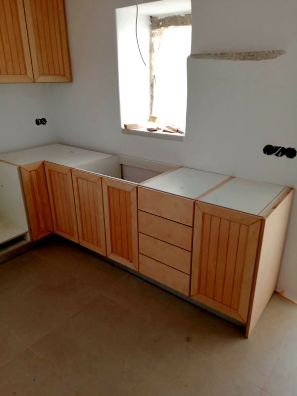 Ντουλάπια κουζίνας με πορτάκια ημιμασίφ από δεσποτάκι, βαμμένα με βαφή ντεκαπέ, χειροποίητη διακοσμητική κορνίζα τύπου Μαίανδρος, μαρμάρινο τραπέζι με διακοσμητικές χειροποίητες κολώνες από κόντρα πλακέ θαλάσσης σημίδα επενδεδυμένο με καπλαμά δεσποτάκι