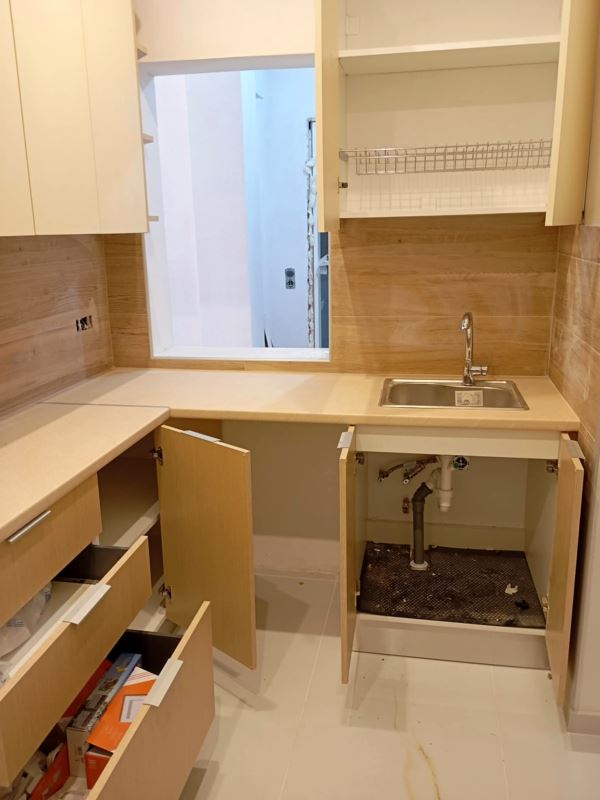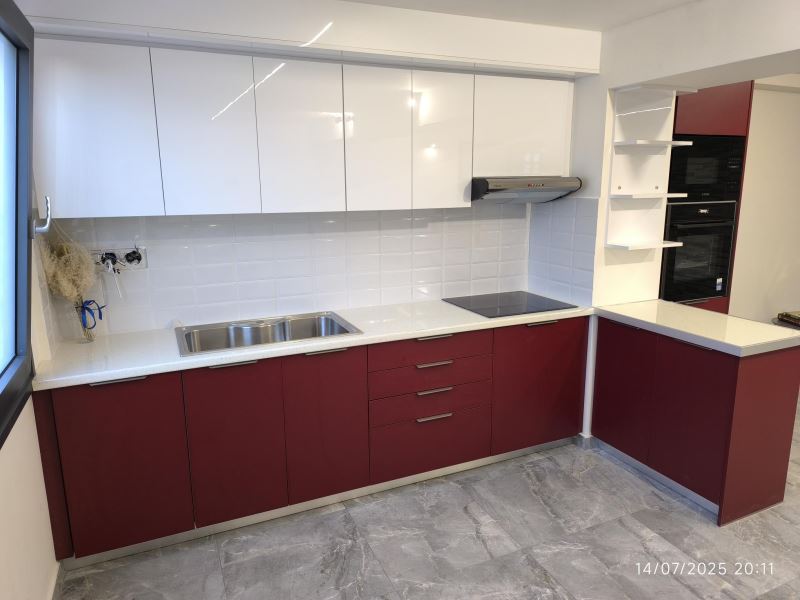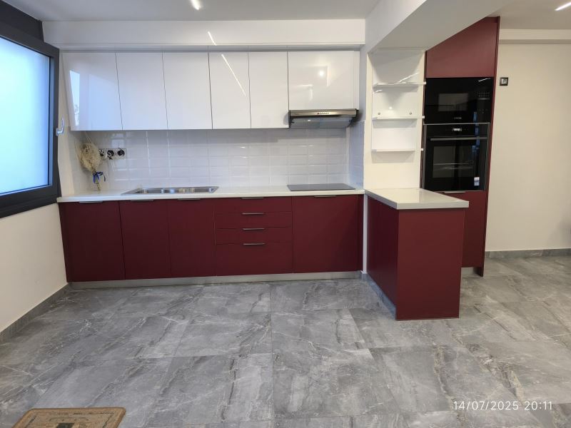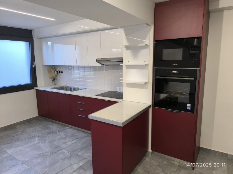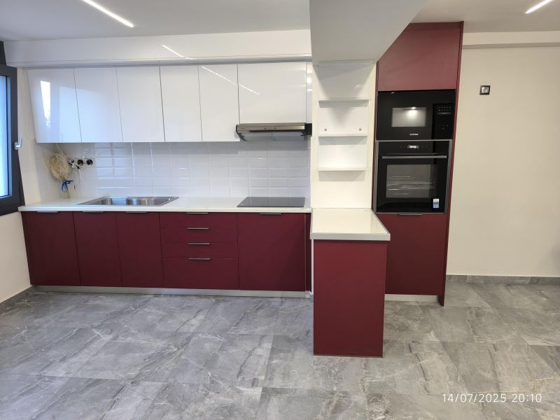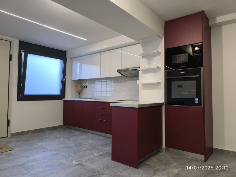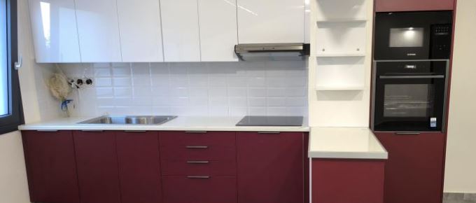 Ντουλάπια κουζίνας από μελαμίνη σε δυο αποχρώσεις με γυαλιστερά λευκά και μπορντό ματ πορτάκια. Κάλυψη του σωλήνα του απορροφητήρα, κουτιά από λευκή μελαμίνη και ξεχωριστή στήλη για φούρνο και μικροκύματα. Πάγκος πυρίμαχος, συρτάρια και βαγονέτα με φρένο, μπάζο inox και εξωτερική ραφιέρα τοιχου.