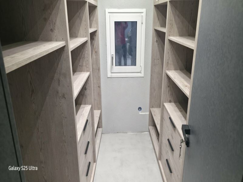 Τετράφυλλη ανοιγόμενη ντουλάπα μελαμίνης, ιδιαίτερη, σε σχέδιο μαρμάρου με αποθηκευτικό ντουλάπι πάνω από την πόρτα, λευκά κουτιά μελαμίνης, μεντεσέδες blum, ράφια, σωλήνες, και ασανσέρ στο εσωτερικό της.