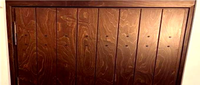 Ξύλινη εσωτερική πόρτα από κόντρα πλακέ θαλάσσης σημύδα, βαμμένη σε καρυδί χρώμα με κάθετες διακοσμητικές λουκιές , διακοσμητικά μαύρα στριφόνια και μαύρα πόμολα.