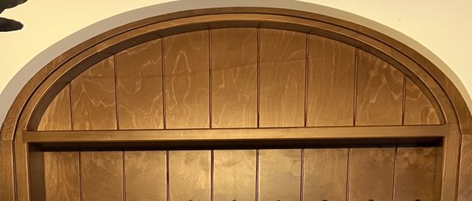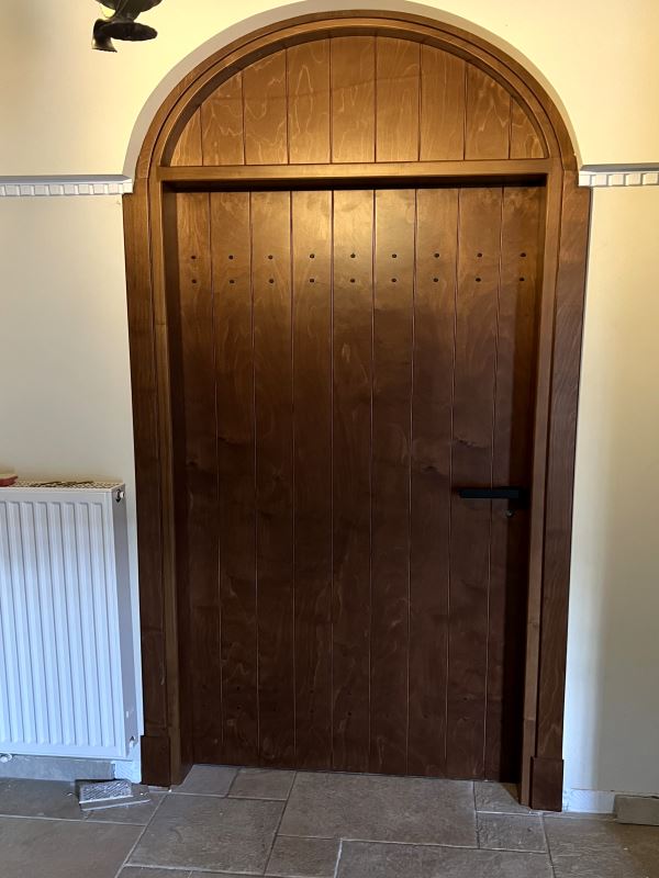 Κυκλική ξύλινη πόρτα με ξύλινο φεγγίτη από κόντρα πλακέ θαλάσσης σημύδα , βαμμένη σε καρυδί χρώμα με κάθετες διακοσμητικές λουκιές, διακοσμητικά μαύρα στριφόνια και μαύρα πόμολα.