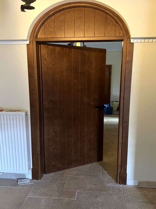 Ξύλινη κατασκευή τετράφυλλης ταμπλαδωτής πόρτας από ξύλο δρυς , με καϊτια για τζάμια, σταθερούς ξύλινους φεγγίτες, μεντεσέδες με γαλλικά σίδερα, περασμένη με λούστρο στο χρώμα του ξύλου.