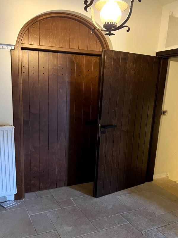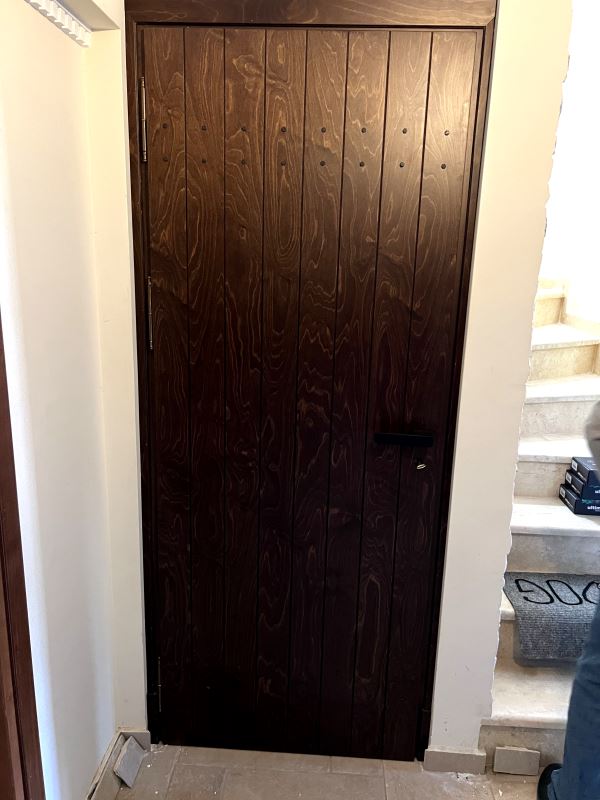 Συρόμενη πόρτα πρεσαριστή από κόντρα πλακέ θαλάσσης σημύδα , με κινισιές και μηχανισμό αχυρώνα. Βαμμένη με οικολογικό χρώμα.